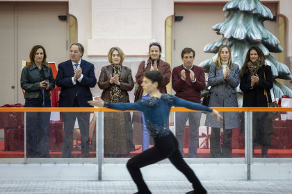 El alcalde de Madrid, José Luis Martínez-Almeida, acompañado por la delegada de Cultura, Turismo y Deporte, Marta Rivera de la Cruz, ha inaugurado esta mañana la tradicional pista de hielo que el Ayuntamiento instala cada año en la Galería de Cristal del Palacio de Cibeles como parte de la programación navideña municipal.